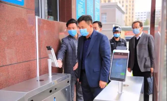 督查小組在視察入校體溫檢測點后,了解到智能測溫設備可通過在相關區域出入口部署人體測溫閘機,實現體溫篩查與人臉識別雙重認證通行,最大可能避免外來人員進入先關區域,確保在疫情期間既不疏于疫情防控,也不漏學生安全防護。技術人員為陜西省教育廳副廳長王紫貴介紹智能體溫測量系統